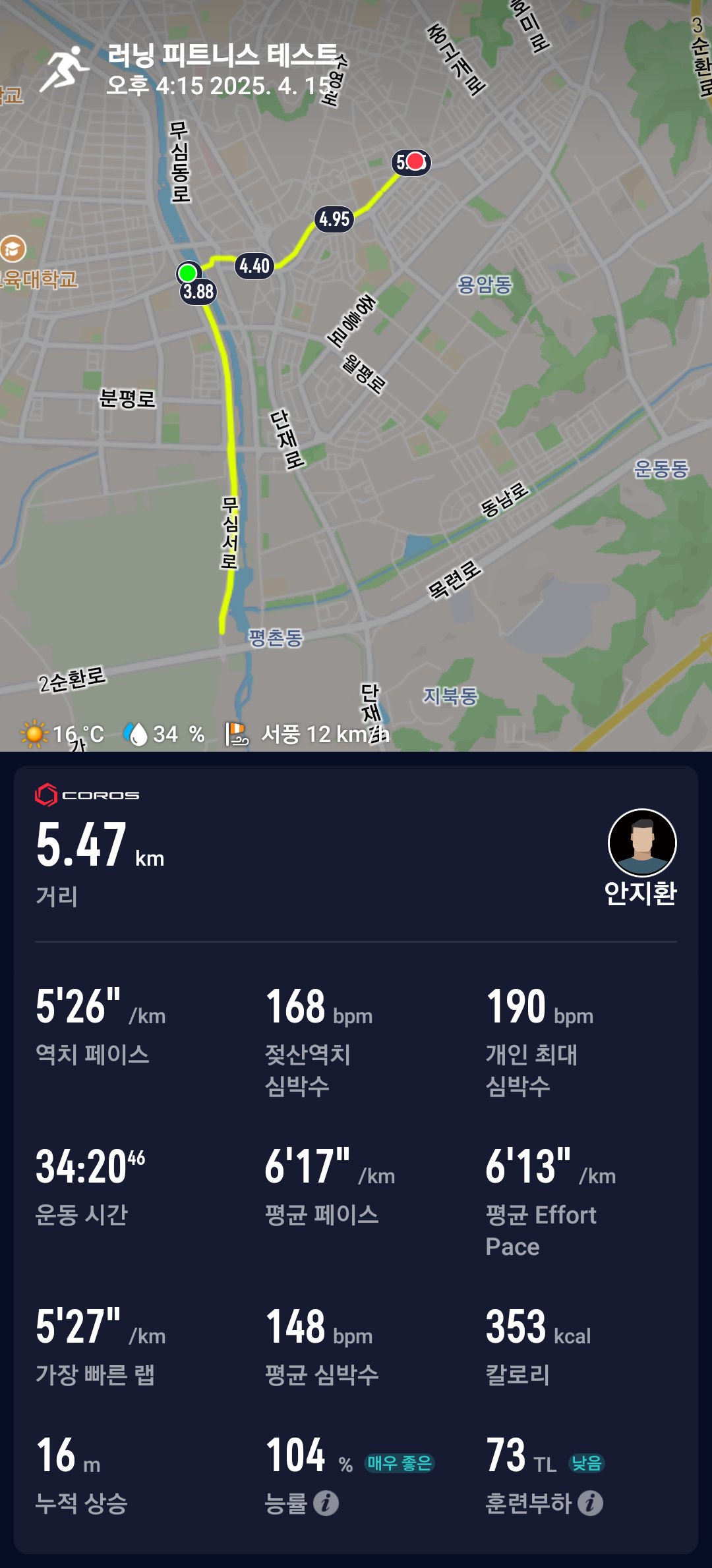 러닝은 가볍게 뛰고 오니 러닝 피트니스 테스트의 수준이 약간 낮아졌다. 마라톤 이후 페이스 메이커를 따라가느라 다소 오버페이스가 된 감이 없지않아 있어. 다시 러닝피트니스를 통해 예상 가이드라인을 조금 낮춰볼 요량으로 6~7km를 뛰었다.
